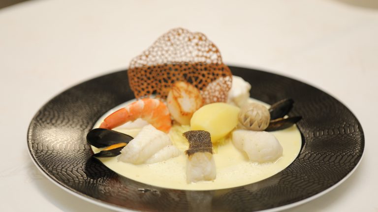 Dressage de l’assiette : Dans des assiettes creuses bien chaudes. Déposer la julienne de poireaux. Surmonter de la pomme de terre. Entourer de sauce sur une belle épaisseur. Disposer Harmonieusement les poissons, les moules, les saint Jacques. Décorer avec les champignons tournés, la tuile d’agrumes et la julienne de poireaux frits.